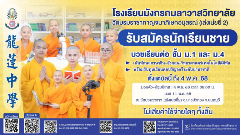 ข่าวสารประชาสัมพันธ์ โรงเรียนมังกรกมลาวาสวิทยาลัย เปิดรับสมัครนักเรียนชาย บรรพชาเป็นสามเณรนักเรียน เข้าศึกษาต่อ ชั้น ม.1 และ ม.4 พร้อมส่งเสริมต่อยอดระดับอุดมศึกษา ทั้งในประเทศและต่างประเทศ16/01/2025